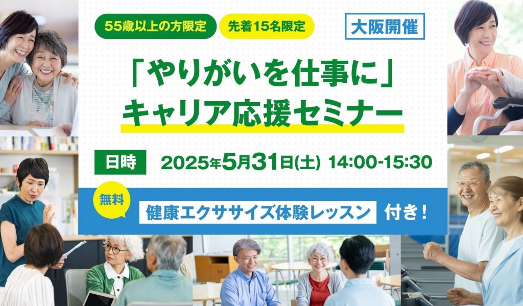 当社グループが介護業界で働いている60歳以上の方を対象に行った調査※では、8割弱の方が60歳を過ぎてから介護業界で仕事を始めていることがわかりました。また、介護業界で働く理由として「生きがい・やりがい」が22.5%、「社会貢献」が11.2%、「健康維持」が10.5%、「人との繋がりをつくる」が10.1%と、半数以上が内発的動機によるものでした。本セミナーでは、60歳を過ぎてから介護業界でセカンドキャリアをスタートし、いきいきと働いている方の事例や、介護の入門資格とされる「介護職員初任者研修」を無料で取得できるプランをご紹介します。また、よりよく働くためのサポートとして、創立20周年を迎えるNPO法人健康支援エクササイズ協会(事務所:愛知県名古屋市、代表:藤原 葉子)と協力し、健康的な身体作りをサポートするエクササイズレッスンを無料で提供します。